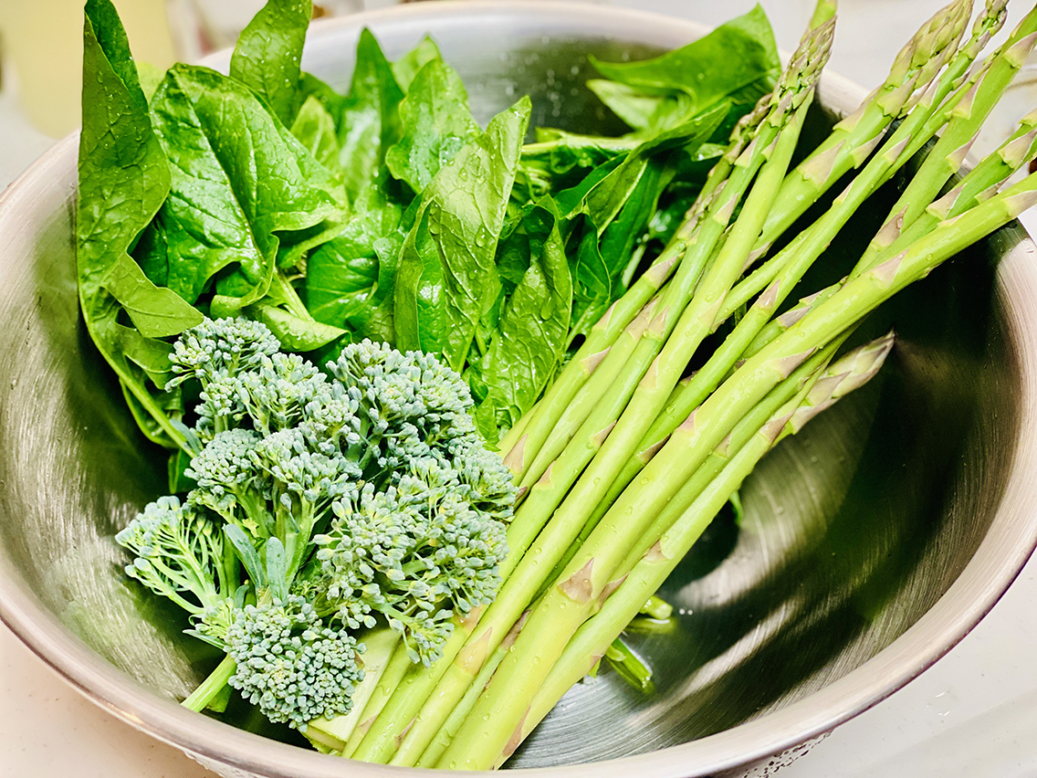 頂いたお野菜は緑色なので、プチトマトで彩りを添え、ベーコンとマッシュルームで旨味をプラス。