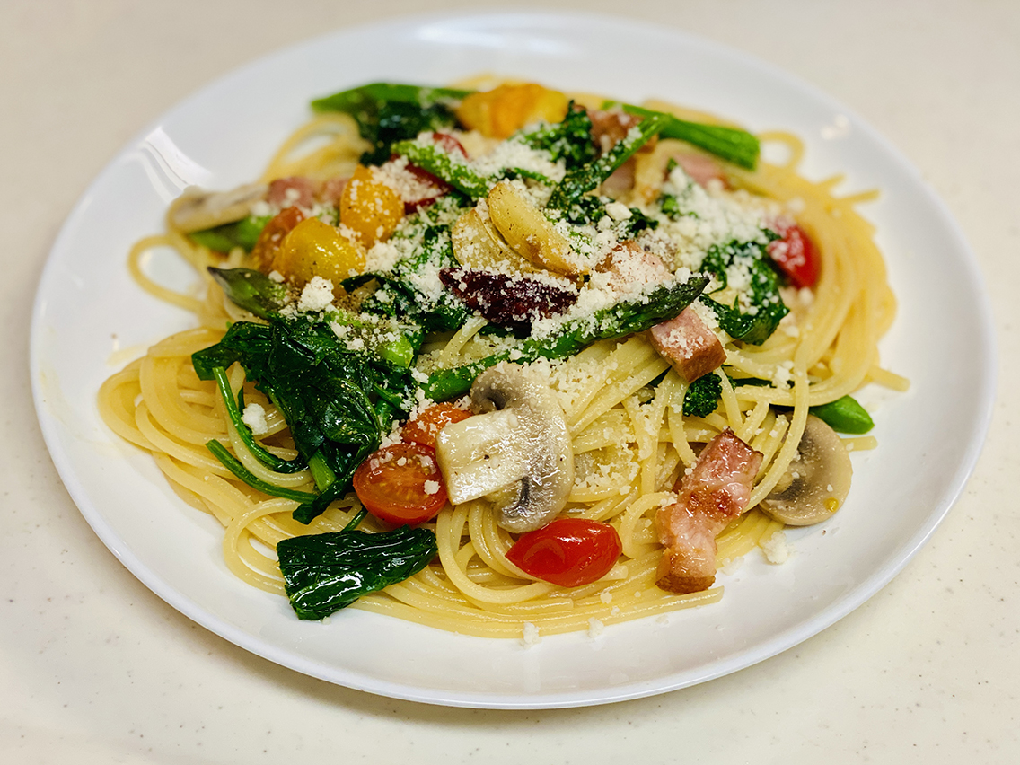 下ごしらえを含めて約20分。ベーコンと彩り野菜のスパゲッティの完成です。